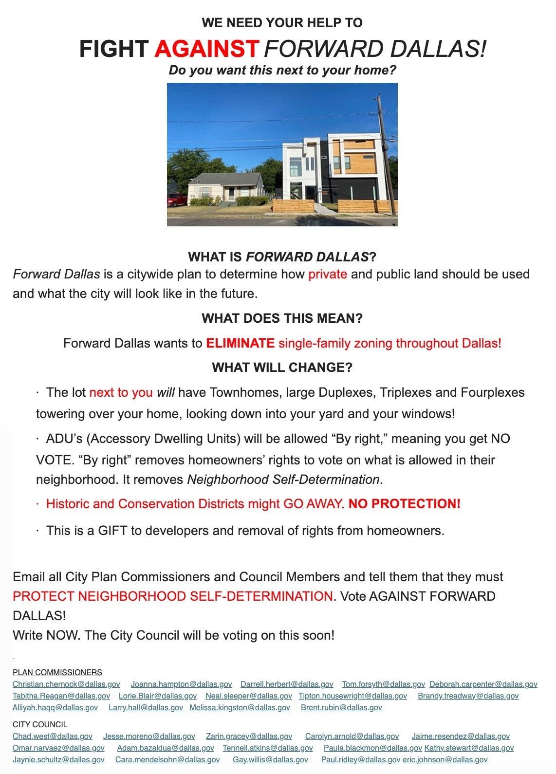 This was my point in my op-ed when I said they are trying to circumvent zoning with code changes. They are trying to change the code to allow ADUs by right where one house can be replaced with multiple houses. Further, Brent Rubin claims that I vehemently oppose middle housing. I do not oppose middle housing and in fact am a strong advocate of preserving middle housing. I object to Forward Dallas encouraging middle housing for workforce families to be torn down for new small apartments.